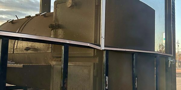 The Iron Lady- This is Tilly— our 16-foot, hand-built, reverse-flow offset smoker.